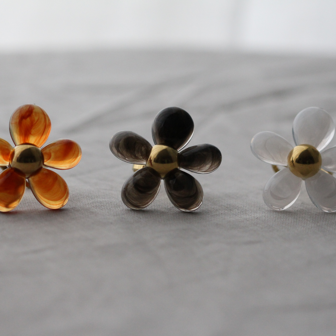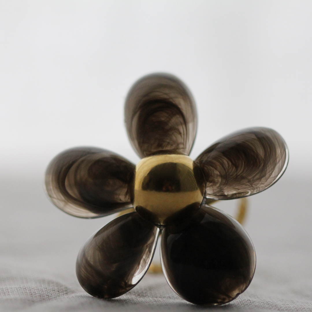 La bague CAMELIA noire séduit par son élégance mystérieuse. Avec ses pétales fumés et son cœur doré, elle allie raffinement et caractère bohème.