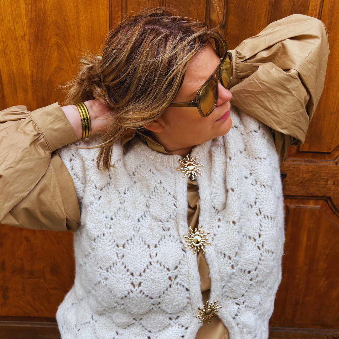 Le pull sans manches qui fait tout le boulot. Avec sa maille moelleuse, ses jolis boutons dorés façon bijoux et son style rétro-cool, il transforme direct ton look en vibe 100% stylée. À porter sur un t-shirt blanc, une chemise ou même seul si tu veux oser 🔥